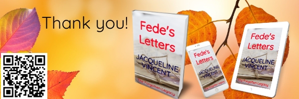 I would like to express my gratitude to several people. First, to John, who has supported my journey to become an author. Now that Fede’s Letters is for sale, I’ll have more time for him and our joint projects. To Dawn, my writing buddy, who has kept me going when the going got tough and has supplied me with luscious dinners when we’ve met on Fridays to work through our writing processes. To Vicky, who has been an amazing help with the historical Spanish, especially with the daily life of 1930s Spain. To all my beta readers, without whom I couldn’t have moved forward and created a compelling novel, plus the technical people without whom Fede’s Letters would never have gone further than a draft.