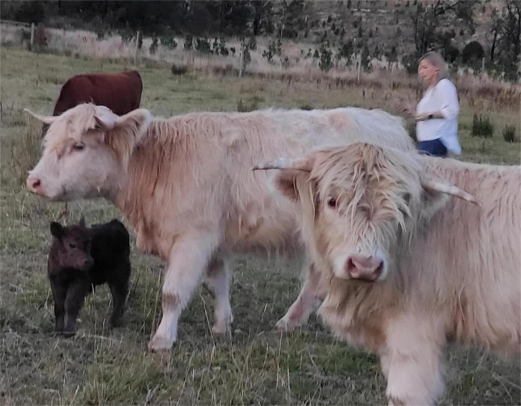 With no time to waste (and no thought of taking anything defensive, because the animals’ safety came first), we charged up the hill. By the time we reached the paddock, the herd was calm, grazing peacefully in a loose circle around the two miniature white Highland cows.