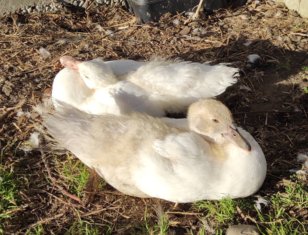 Their daily routine has become quite the adventure. Starting with puddles, graduating to ditches, and now confidently trekking down to the stream, they spend their days splashing, dabbling, and learning the fine art of feeding. Watching them “tip up” to forage is pure comedy—more often than not they flip right over onto their backs, little feet in the air! Thankfully, their fluffy not-quite-feathers double as built-in floatation devices, so after a splash and a shake, they’re back upright with a beak full of weeds.